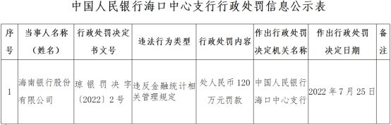 中国经济网北京7月28日讯?中国人民银行网站近日公布行政处罚决定书(琼银罚决字〔2022〕2号),海南银行股份有限公司存在违反金融统计相关管理规定的违法行为类型,中国人民银行海口中心支行对其处人民币120万元罚款。?